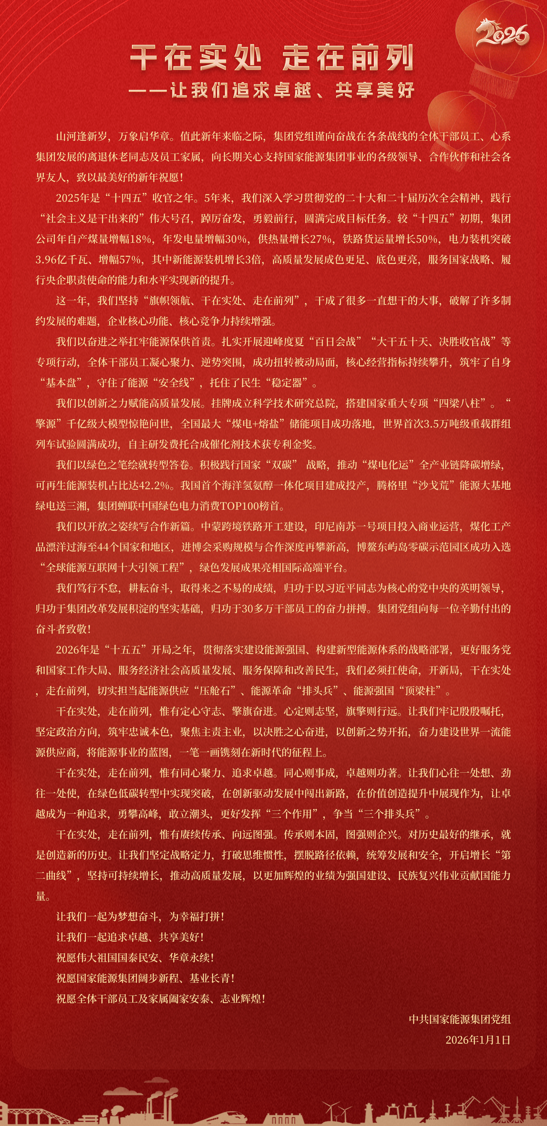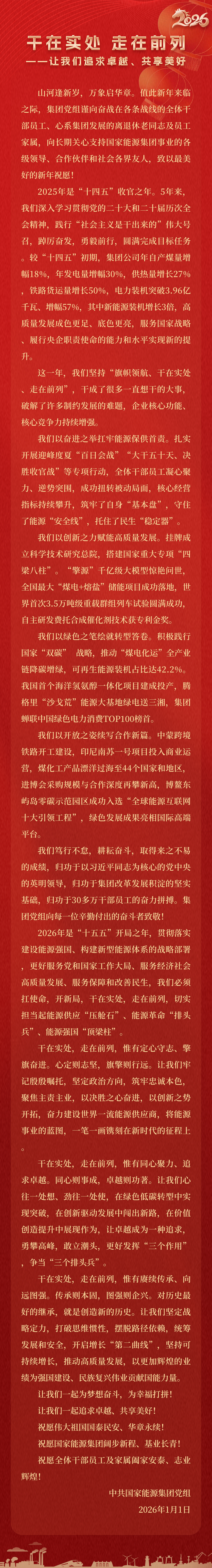 國家能源集團(tuán)胸懷“國之大者”,增產(chǎn)增供、穩(wěn)價穩(wěn)市,積極服從服務(wù)國家戰(zhàn)略、保障國家能源安全、助力國民經(jīng)濟(jì)穩(wěn)增長,推動煤炭安全綠色智能、煤電清潔高效穩(wěn)定、現(xiàn)代煤化工高端多元低碳、運(yùn)輸物流協(xié)同一體、新能源多元創(chuàng)新規(guī)模化發(fā)展,全力擔(dān)當(dāng)能源強(qiáng)國頂梁柱,能源供應(yīng)壓艙石,能源革命排頭兵。